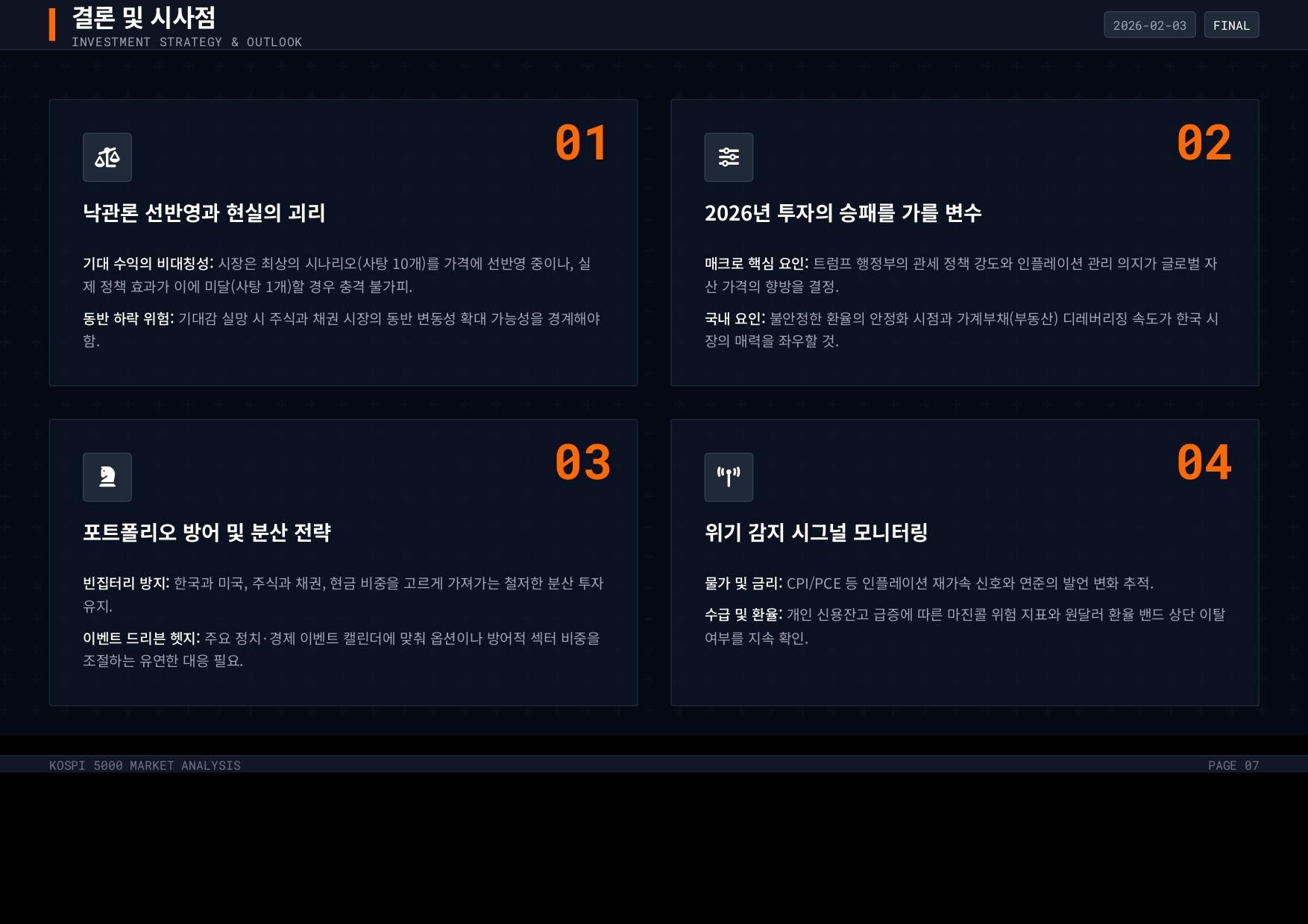 - 분산 투자 강화: '국장 탈출' 기조에서 벗어나 국내 자산의 매력이 높아진 것은 사실이나, 미국과 한국 증시 중 한 곳에 올인하기보다 양쪽 포트폴리오를 고르게 유지하는 '빈집털이 방지' 전략이 유효하다.