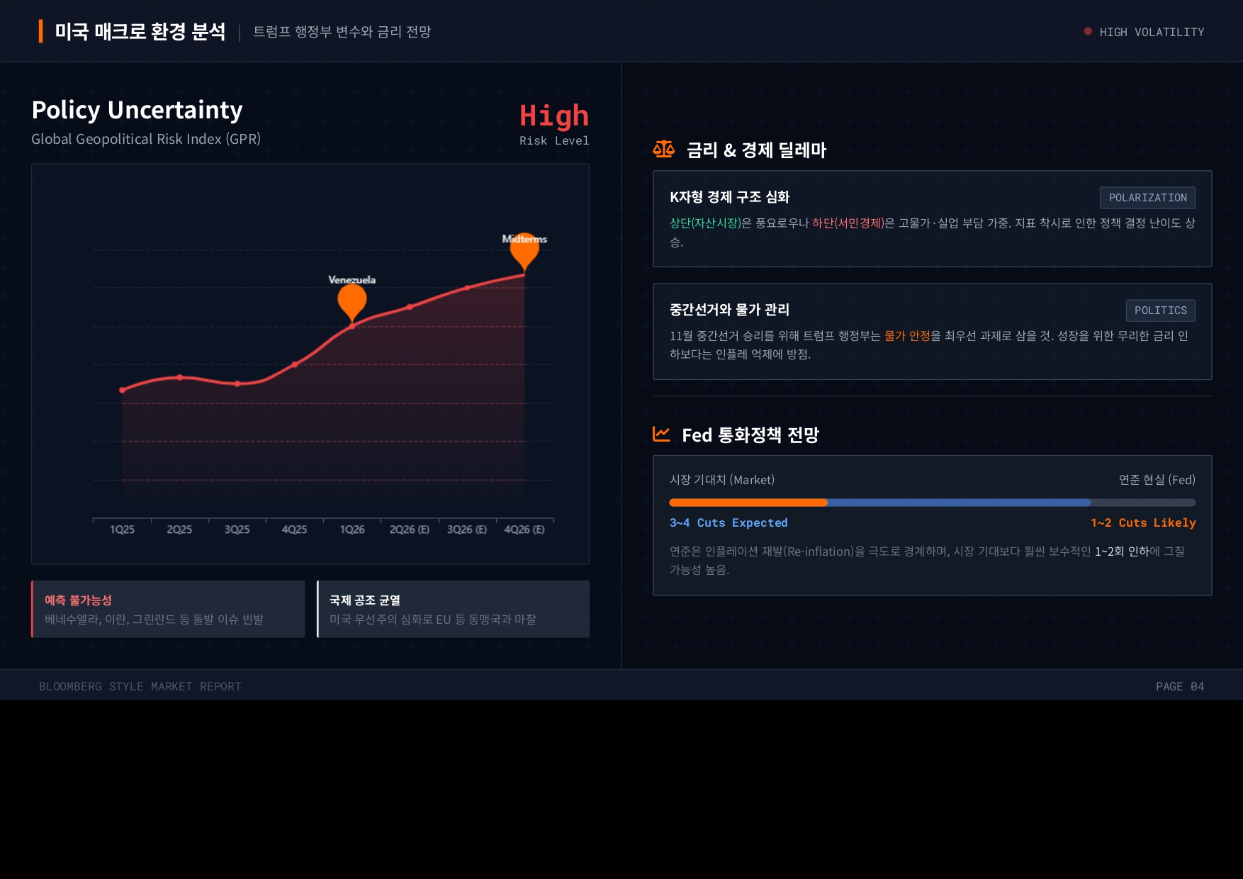 - 미국 금리 인하 기대치 조정: 시장은 3~4회의 금리 인하를 기대하고 있으나, 인플레이션 압력과 서민 경제(K자형 구조 하단) 보호를 위한 트럼프 행정부의 물가 관리 의지로 인해 실제 인하 횟수는 1~2회에 그칠 가능성이 높다.