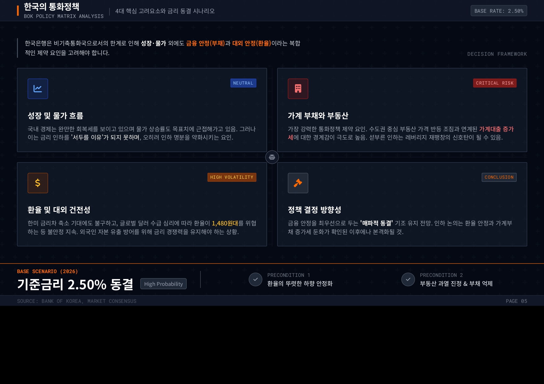 - 한국은행의 금리 동결 기조 유지: 환율 불안정과 가계 부채(부동산) 문제라는 두 가지 핵심 제약 요인으로 인해 한국은행은 금리 인하에 신중한 입장을 고수할 것으로 전망된다.