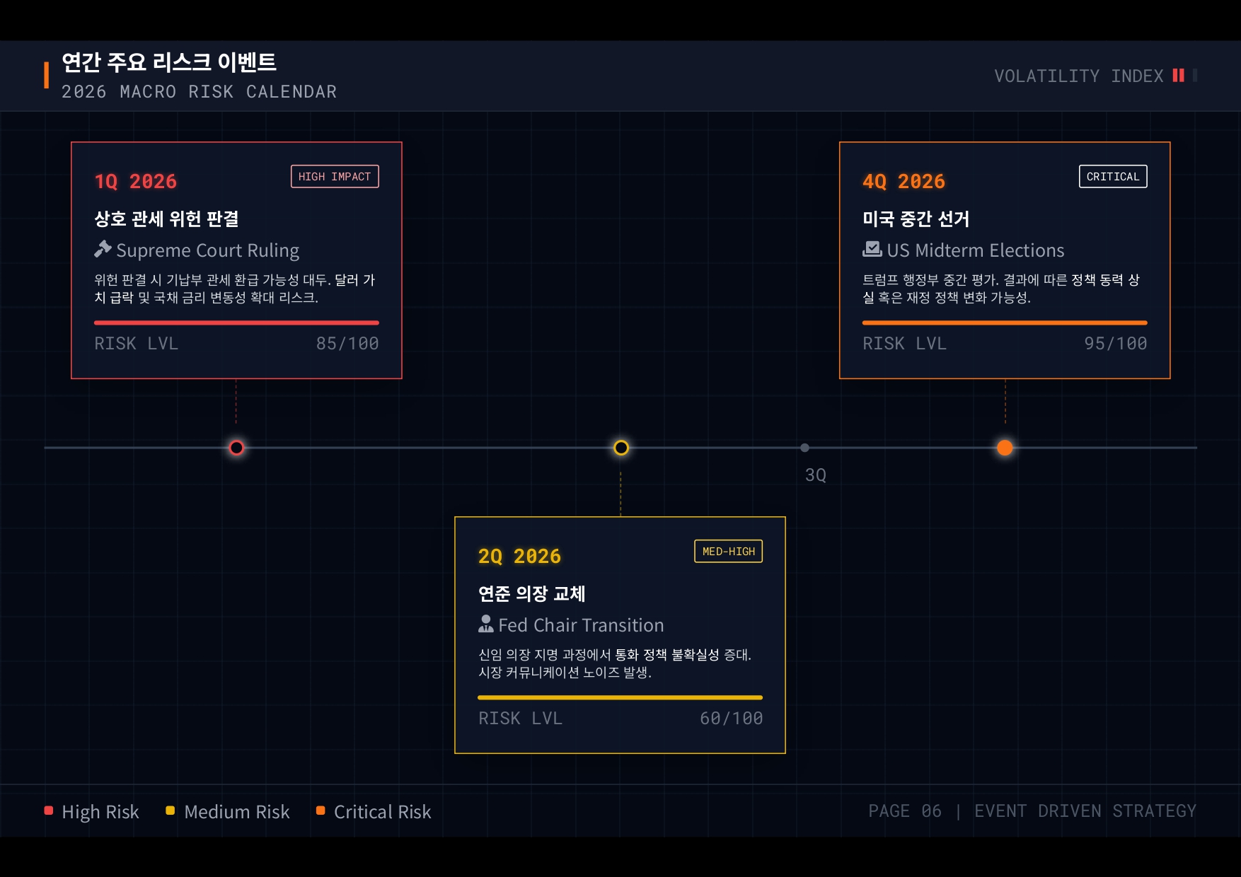 - 예정된 주요 리스크 이벤트: 1분기 상호 관세 위헌 판결 여부, 2분기 연준 의장 교체, 4분기 미국 중간 선거 등 시장에 충격을 줄 수 있는 정치·경제적 이벤트가 산재해 있다.