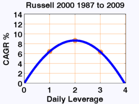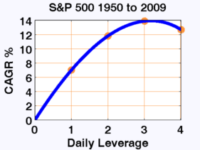 즉, 장기 수익이 극대화되는 최적의 레버리지가 있습니다.
