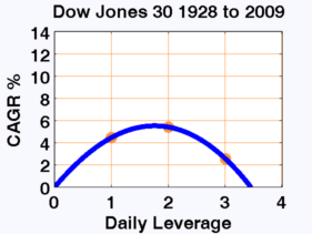 이것은 최적의 레버리지(recession)를 결정하는 수익 / 변동성 트레이드오프를 명확히 보여줍니다.