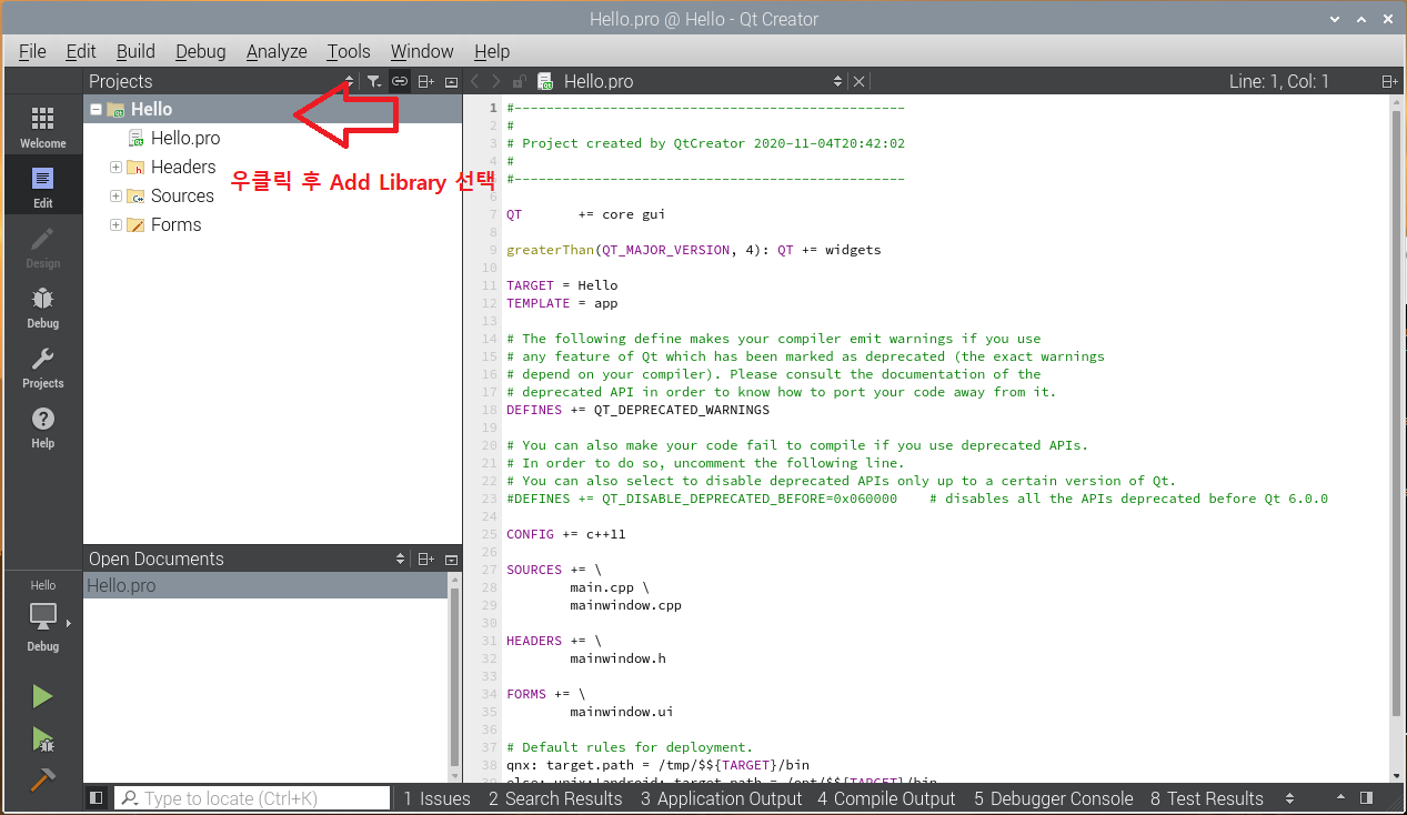 QT Creator 실행 -> Activate Projects View -> Project 명 우클릭 -> Add Library