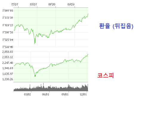 환율을 뒤집어서 코스피 위에 올려보니 소름 돋게 맞아떨어지네요..