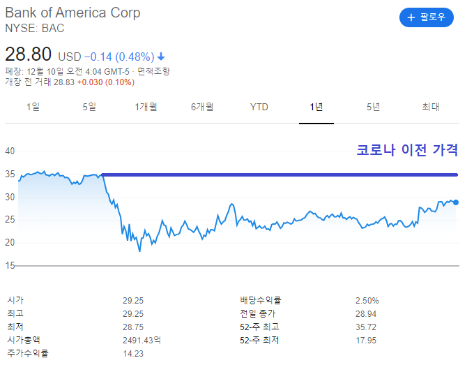 JP모건, 뱅크 오브 아메리카 등등 코로나 위기 터질 때 이후 회복하지 못했지만