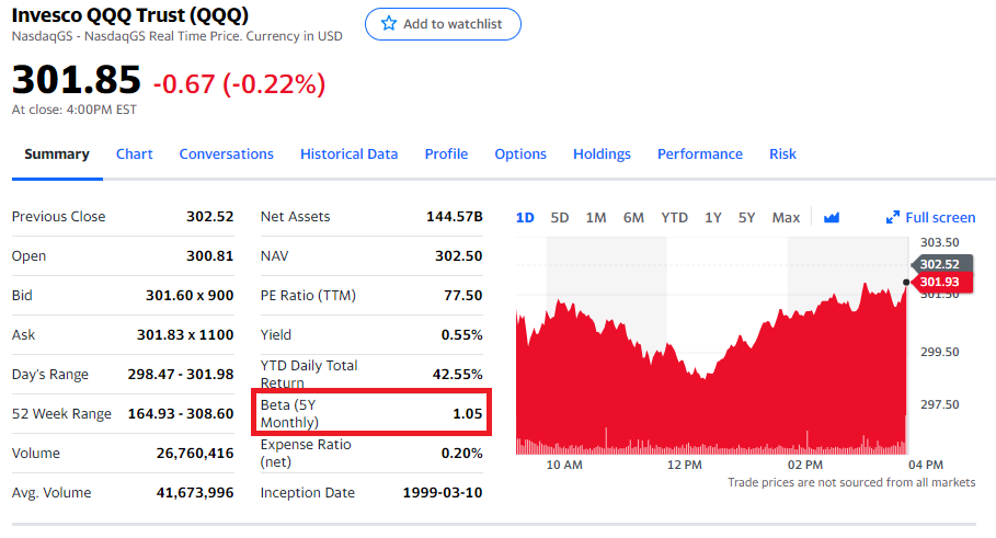 QQQ의 베타 값은 1.05 네요. 즉 시장이 1% 오르면 QQQ는 1.05% 오르네요.