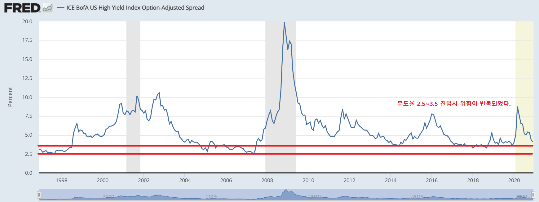 2.5~ 3.5의 부도율에 가까워지면 어김없이 찾아오는 불황과 사건들.